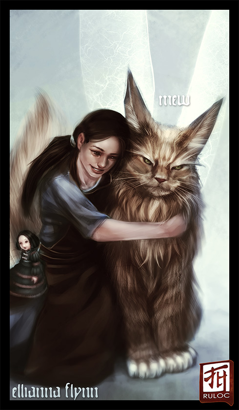 Her companion and best friend in her journeys is her Eidolon "Mew". She refers to Mew as her "Fluffy Planar Kitty" and is a large sized serious looking cat with the strength and claws of leopard or panther, but the looks of a fluffy cat with overly long ears (anime elf sized) and gossamer wings.